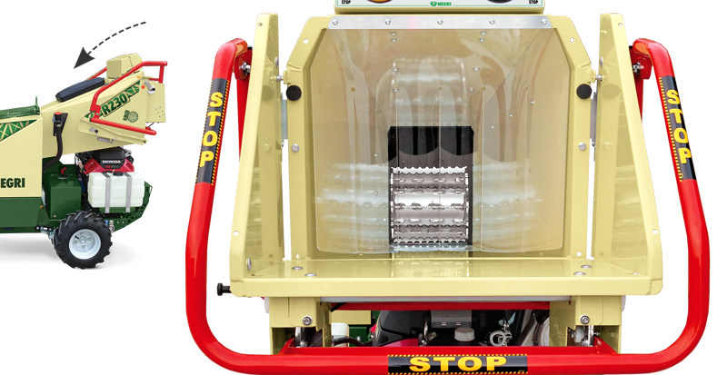 Erleichtert den Transport und gewährleistet die Sicherheit des Bedieners, indem der zufällige Auswurf von Hackgut in seine Richtung verhindert wird.